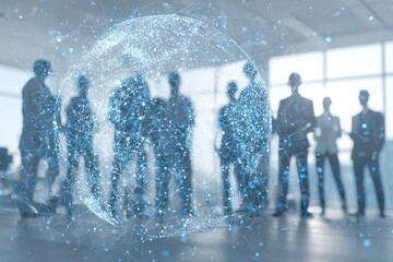 Silhouettes of business people overlaid with a glowing digital network globe.