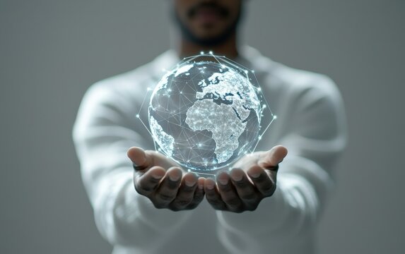 Business professional holding glowing digital globe surrounded by abstract data points and technology elements. innovation, global connectivity, and advancement of digital technologies