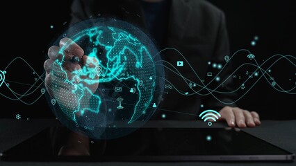 Dynamic visual representation of innovative communication technology featuring a globe and network interface on a tablet, highlighting data connectivity and interaction. Cipher