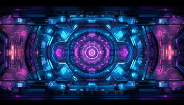 Futuristic digital tunnels with glowing neon lights and intricate geometric patterns