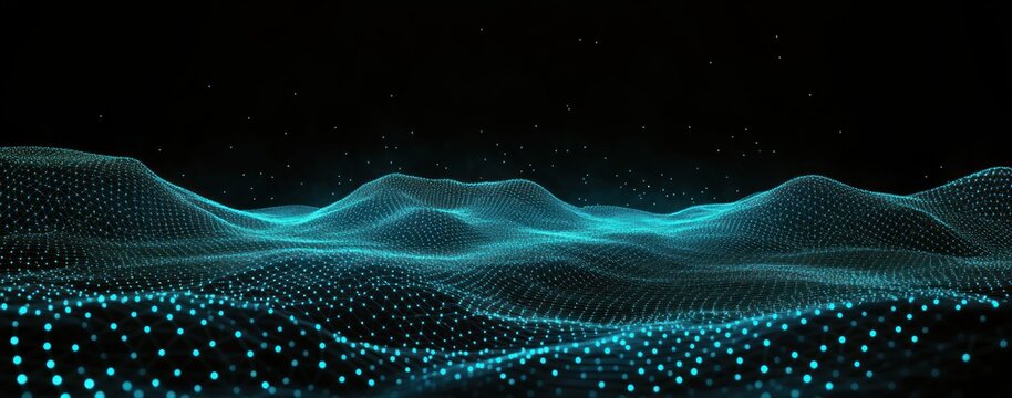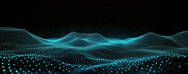 glowing turquoise dotted wireframe landscape with undulating waves and floating particles, serene futuristic digital horizon