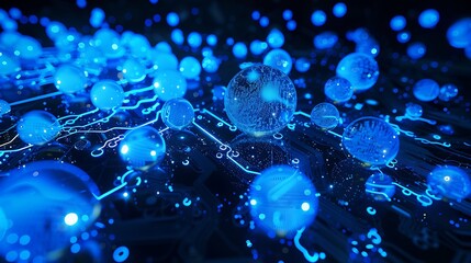 Floating blue particles arranged over a smart circuit network glowing with quantum field movement .