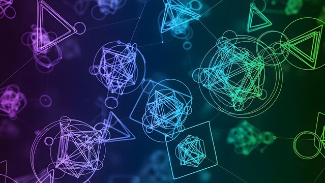 A dynamic digital background featuring glowing geometric shapes like cubes, triangles, and circles interconnected by thin neon lines on a dark gradient.