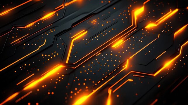 Abstract futuristic digital circuit board with glowing orange lines and dots on black background creating high-tech and dynamic energy effect