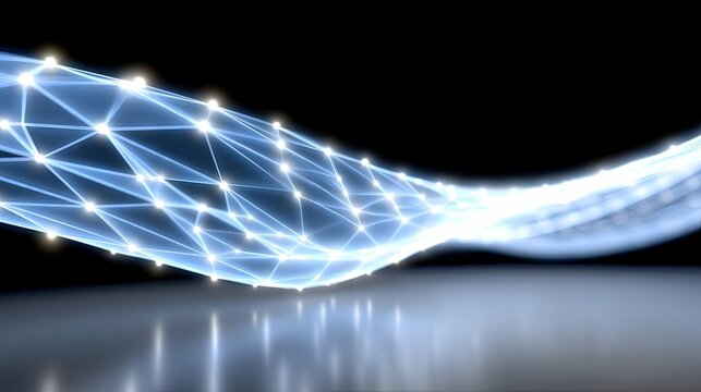 An abstract digital network with glowing nodes connected by lines, set against a dark blue background. The surface beneath is wavy and reflective.