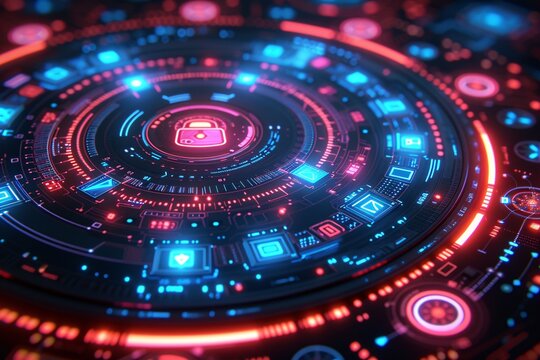 Futuristic digital control panel with glowing neon interface and complex data display. Concepts of advanced technology, cybersecurity, and innovation.