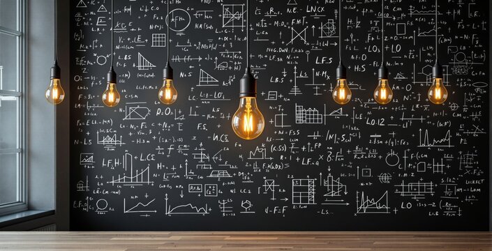 Light bulb with networking over mathematical equations – digital innovation idea concept