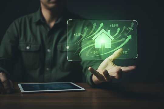 Digital financial data visualization with glowing green graphs and numbers on a dark background, showcasing market trends and analytics in a modern design concept