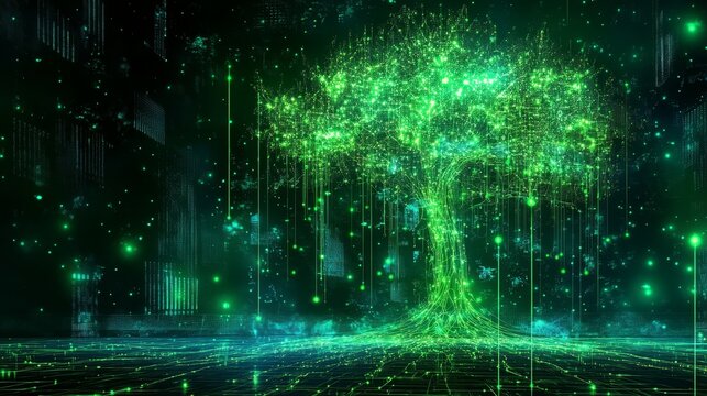 Glowing Green Digital Tree with Data Streams on a Dark Background, Abstract Technology Concept