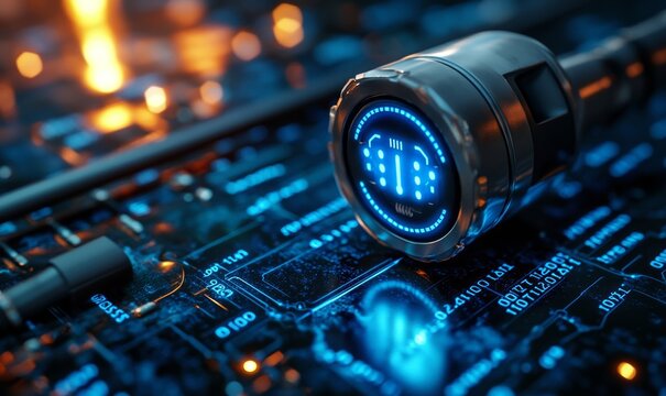 Future EV car electric plug and battery charger blue abstract digital binary code background. Alternative and sustainable energy concept. New futuristic system technology symbol. , Generative AI