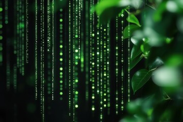 A visually striking blend of green foliage and digital binary code, symbolizing the intersection of nature and technology.