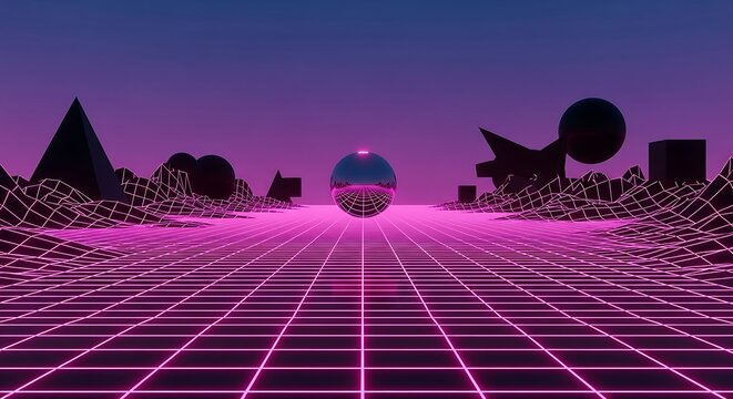 Futuristic Grid with Neon Lights: Abstract Technology Background with Glowing Lines and Geometric Shapes