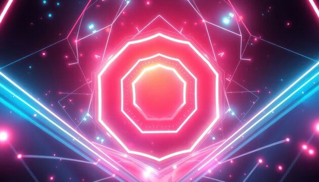 Abstract neon light tunnel with glowing geometric shapes in vibrant pink, blue, and red, creating a futuristic digital background for events, technology, or entertainment.