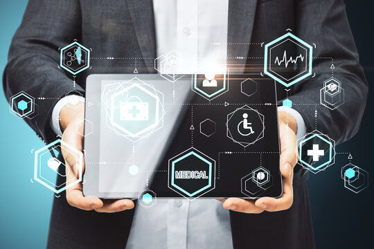 Businessman holding digital tablet with glowing medical interface hud hologram
