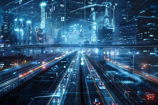 Overlaying cyan-blue circuit graphics linking to multi-lane highway with light trails, bar chart
