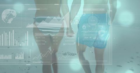 Couple walking on beach with futuristic holographic data