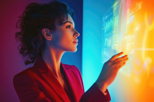 Woman in red blazer interacts with a holographic interface displaying data visualizations and graphs.