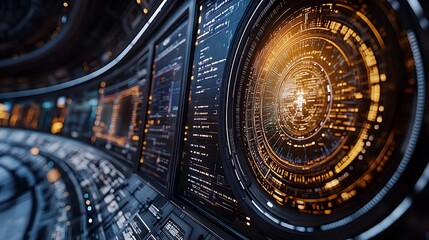 Futuristic control panel with glowing holographic displays showing data streams and code.