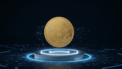 Rotating golden Bitcoin coin above circular platform in tech environment, with blue rings and nodes