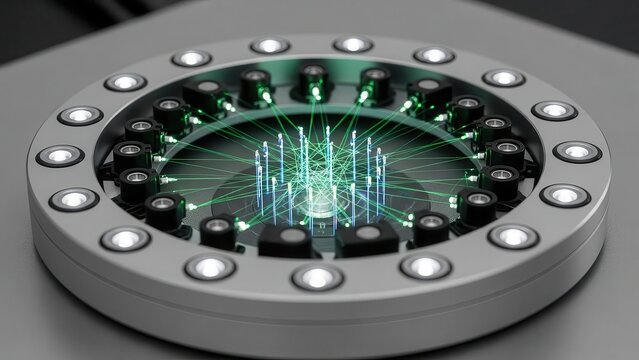 Close up view of a futuristic circular device with glowing green digital data streams and illuminated lights on a metallic surface