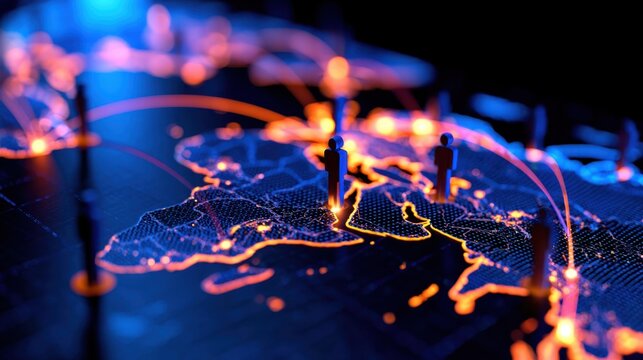 glowing digital globe with illuminated continents above a hexagonal grid, surrounded by rising orange data spikes and floating lights conveying a futuristic connected energy