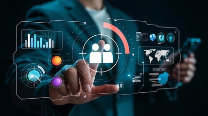 Businessman interacting with a futuristic holographic interface displaying data analytics charts and target audience demographics for business strategy