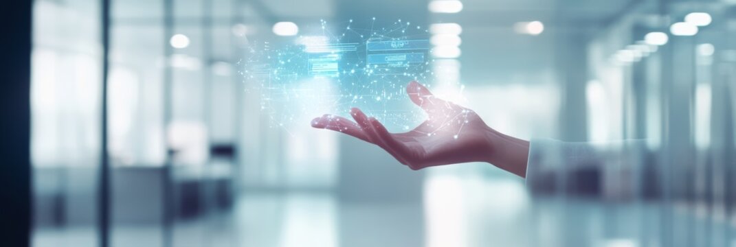 Hand interacting with floating digital interface displaying data and code in a bright office. Concept of coding and development.