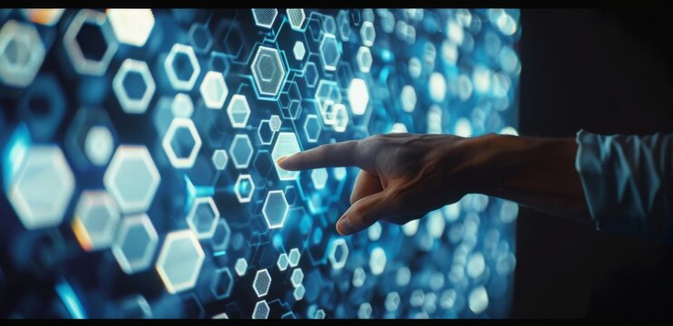 Futuristic digital interface with hexagonal icons and holographic display