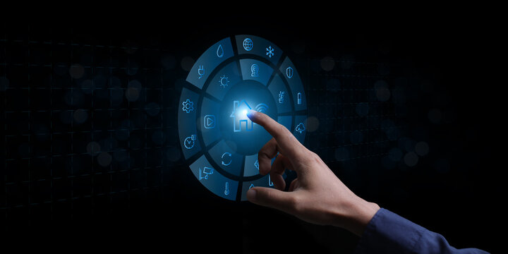 Hand using AI with smart home app on the room, circular interface of the smart home automation assistant on the virtual screen and user touches the button, smart home digital interface