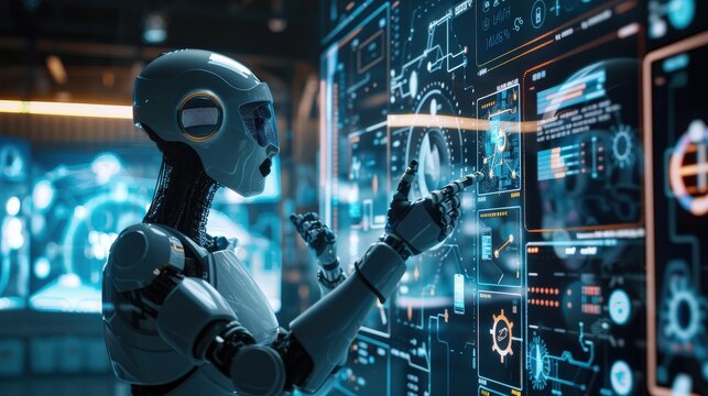 A robot is pointing at a screen with a blue background. The robot is white and has orange accents. The robot is in a futuristic setting with a lot of technology