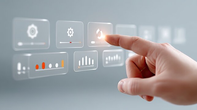 Hand Interacting With Transparent Futuristic Digital Hud With Power Icon and Graph Display on Gray Background
