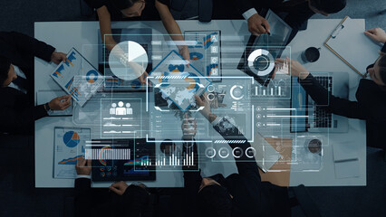 Business data visualization on digital screen modern hud interface with hand touching virtual display for analysis and monitoring