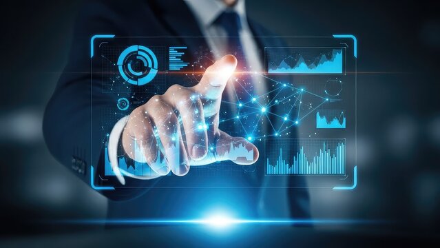 Businessman interacts with futuristic digital interface displaying graphs and charts in a dark room with blue neon lights with technology and innovation