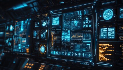 Detailed futuristic interface panels display data streams, graphics, and icons in a cool blue tone.