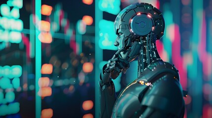 Futuristic Robot Analyzing Financial Data and Market Trends on Digital Interface