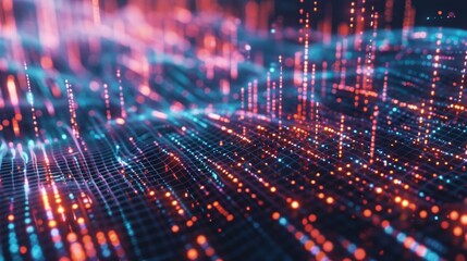 futuristic digital cityscape with glowing orange data streams, vertical light spikes, blue grid lines, bokeh particles and blurred high-rise silhouettes conveying energetic technological pulse