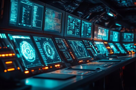 Futuristic command center interface with high-tech digital screens and glowing blue data displays for sci-fi and cybersecurity themes