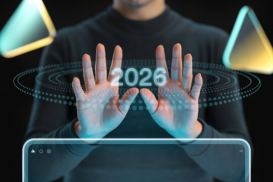Futuristic business person interacting with a holographic interface displaying the glowing number 2026, symbolizing future planning, technology goals, and digital innovation.