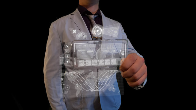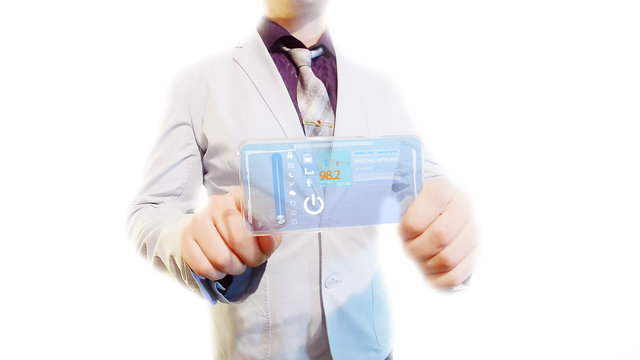 Man with a futuristic screen.  The concept of the future interface on a transparent display