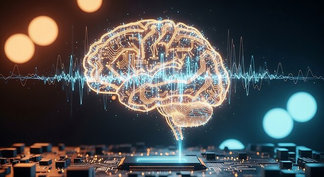 Glowing human brain circuit on abstract computing chip surrounded by digital wave patterns