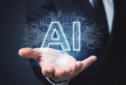 Futuristic AI Typography Hovering Over Human Palm Representing Digital Innovation and Machine Learning