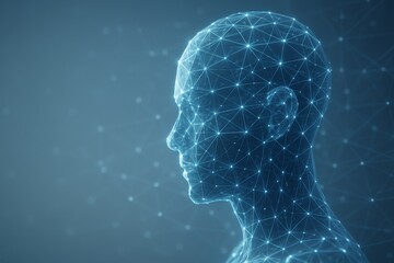 Futuristic digital human head composed of glowing blue network lines and nodes, symbolizing artificial intelligence and technology concept on dark background. Ai generative