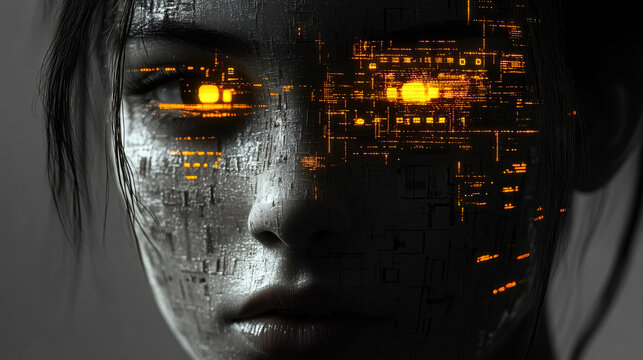 Depicting a futuristic metallic face with glowing orange lights, presenting a blend of human and machine elements seamlessly.