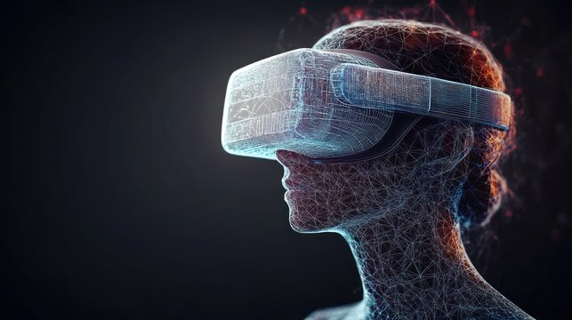 wireframe human profile wearing a glowing virtual reality headset with neon blue and orange digital mesh, conveying focused immersion and futuristic curiosity