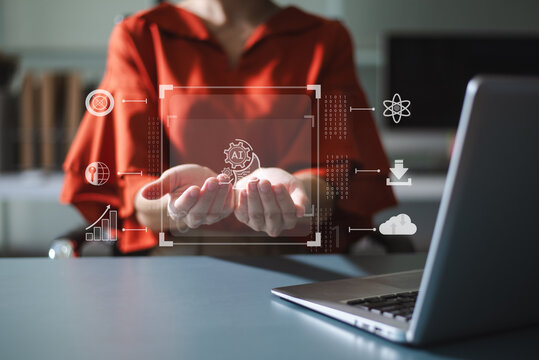 Woman hand with cupped hands under a glowing AI interface surrounded by futuristic tech icons. Ideal for artificial intelligence, innovation