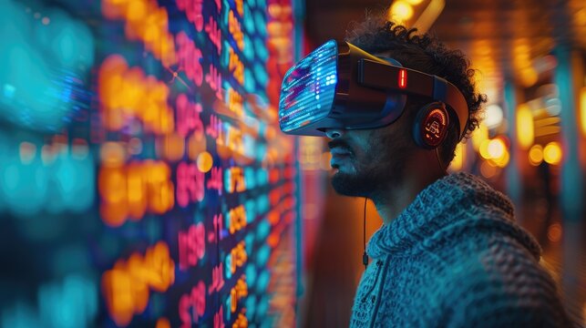 Man immersed in virtual financial data through vr headset