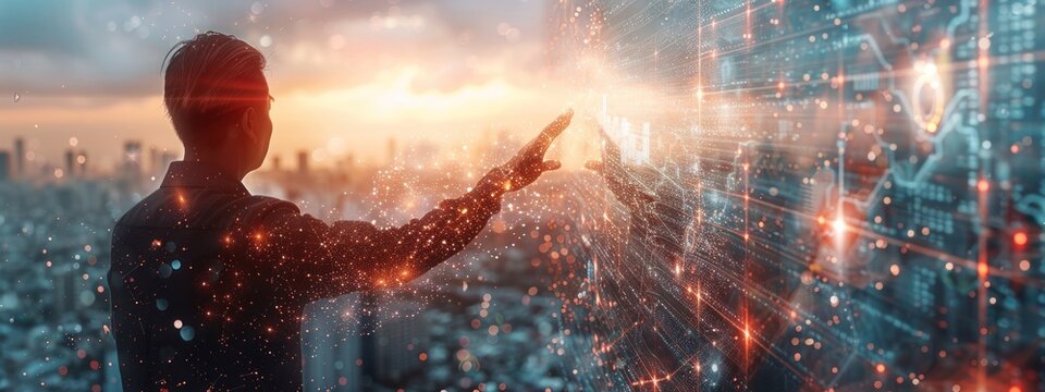 A futuristic robotic hand interacts with a dynamic display of digital data and graphs, representing advancements in technology and artificial intelligence. Xenic