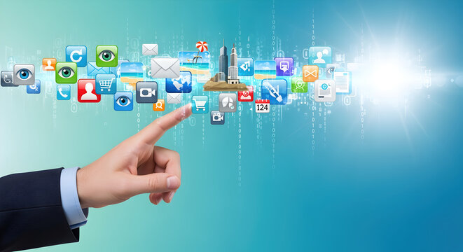 Hand Interacting with Floating App Icons on Abstract Blue Digital Background Highlighting Connectivity and Communication