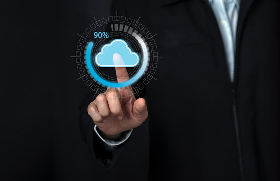 Businessmen using the mouse for loading data applications, show a loading icon waiting on a virtual display. Download digital data website. Virtual loading icon for software program update concept.