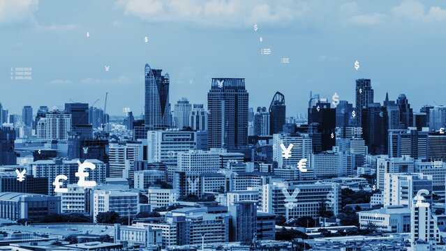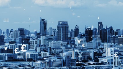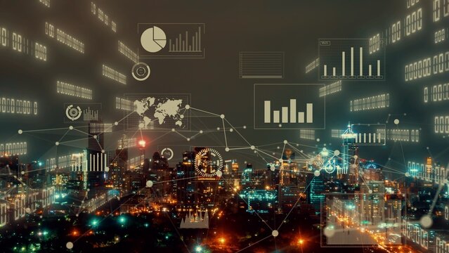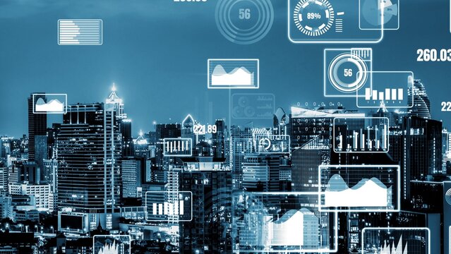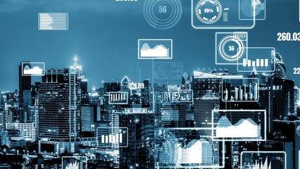 Business data analytic interface fly over smart city showing alteration future of business intelligence. Computer software and artificial intelligence are used to analyze big data for strategic plan .